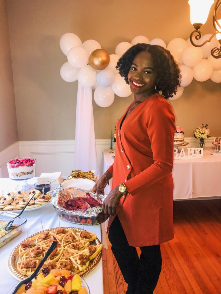 I wanted the shower to be an intimate brunch. To know me is to understand that I love brunch, and I will incorporate it into any early event if possible! With the party decor and styling, I was going for nice, simple, chicness: white, dusty and pastel blues, and hint of pink in the florals. I didn’t want it to scream traditional BOY shower, but instead say, Sheila’s baby boy shower– if that makes sense lol. We kept the shower games to a minimum (2). I wanted this to be a space for good conversation, mingling, and enjoyment of good food and drinks! Plus space was too limited for all of the ‘go find so and so’ games! I listed details of the shower, hopefully you can use as inspo for your next event!