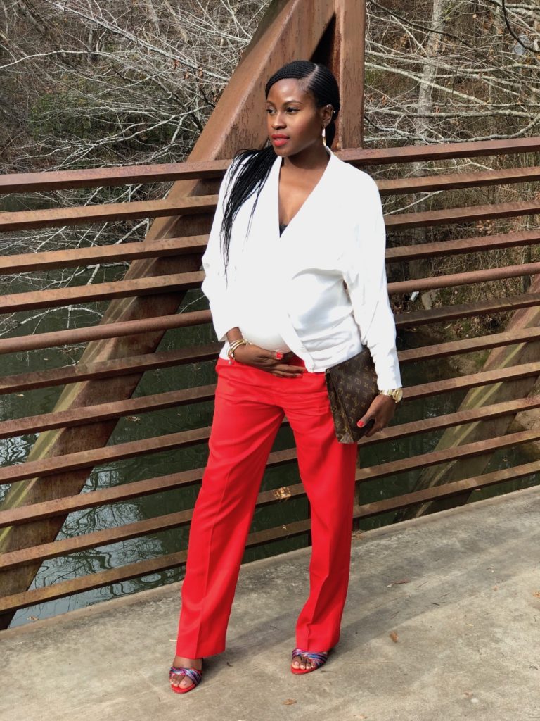 None of my featured looks are maternity wear, they are pieces that I already had in my closet, or an item that I purchased while keeping a growing bump in mind: elastic waist band pants, and loose fitting top.