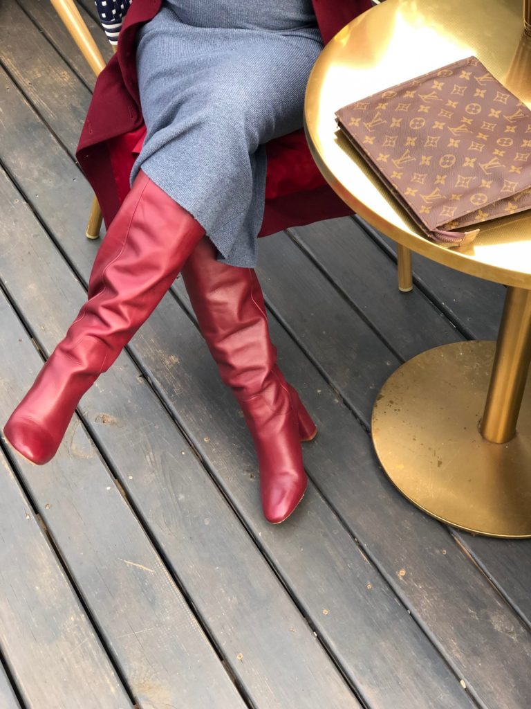 Look 1: Banana Republic sweater, long vest, and skirt all thrifted, Zara high heeled leather boots Look 2: H&M red pull on pants, Zara blouse, Zara multi strap heels Look 3: Zara cream skirt, Forever 21 ivory off the shoulder crop top, Aldo snakeskin boots, thrifted/vintage find jacket